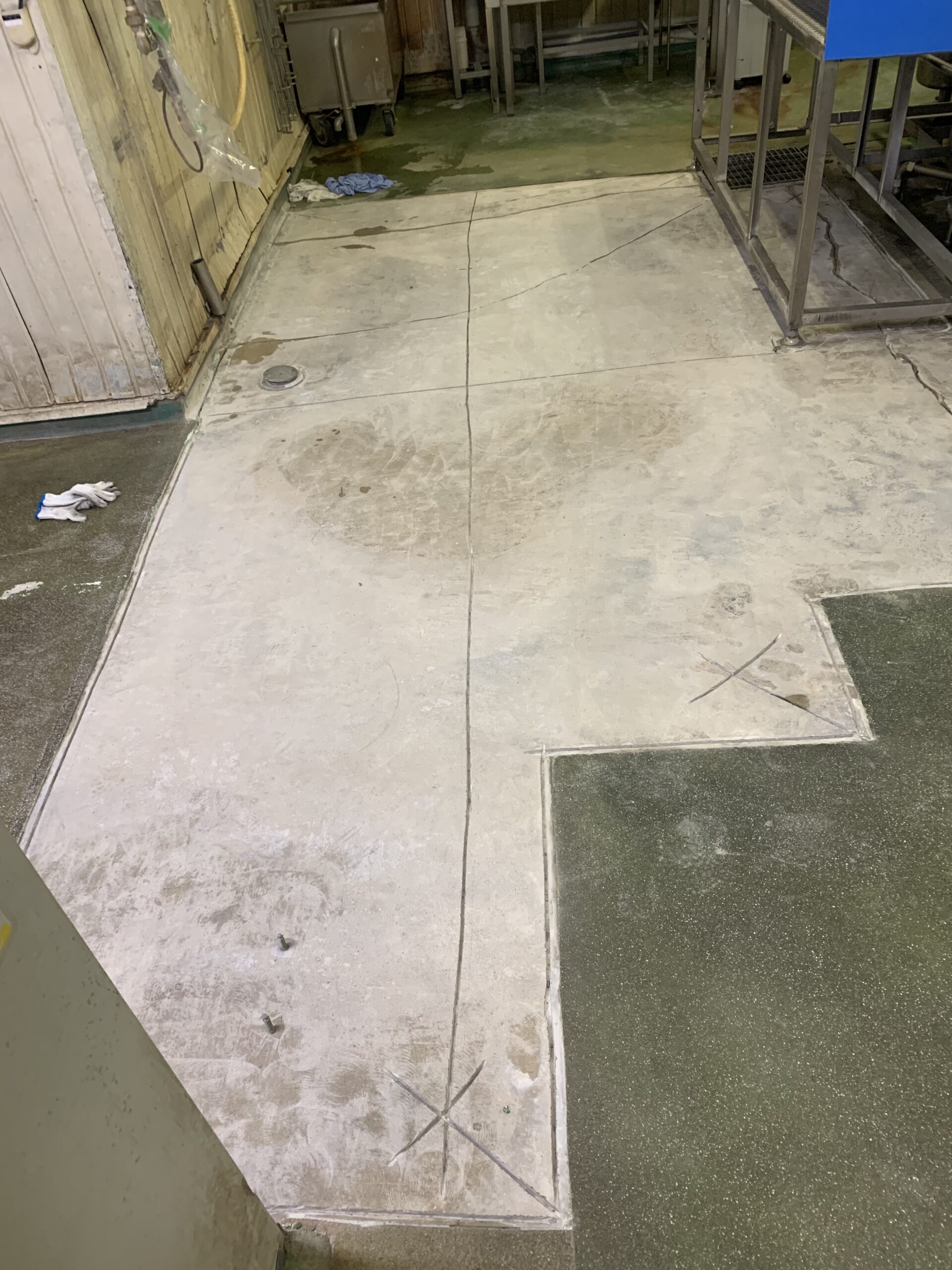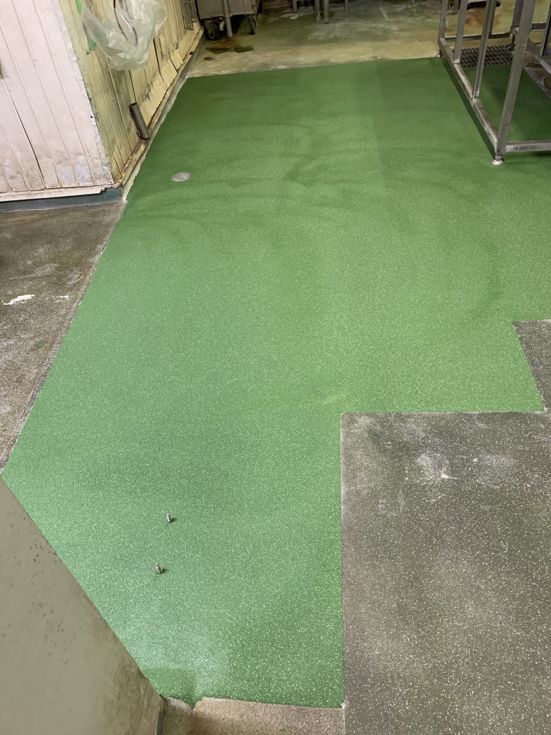 塗床工事の難しいところですが、仕上げをしてしまうと同じに見えるという点になります。仕上げ工程は同じなので、一見同じにみえますが、下地処理作業を蔑ろにすると早期での剥離や不具合に直結します。今回の施工してある材質は水性硬質ウレタンといって、食品加工工場では適正な材料でしたが、下地処理不良によって剥離がおきていました。