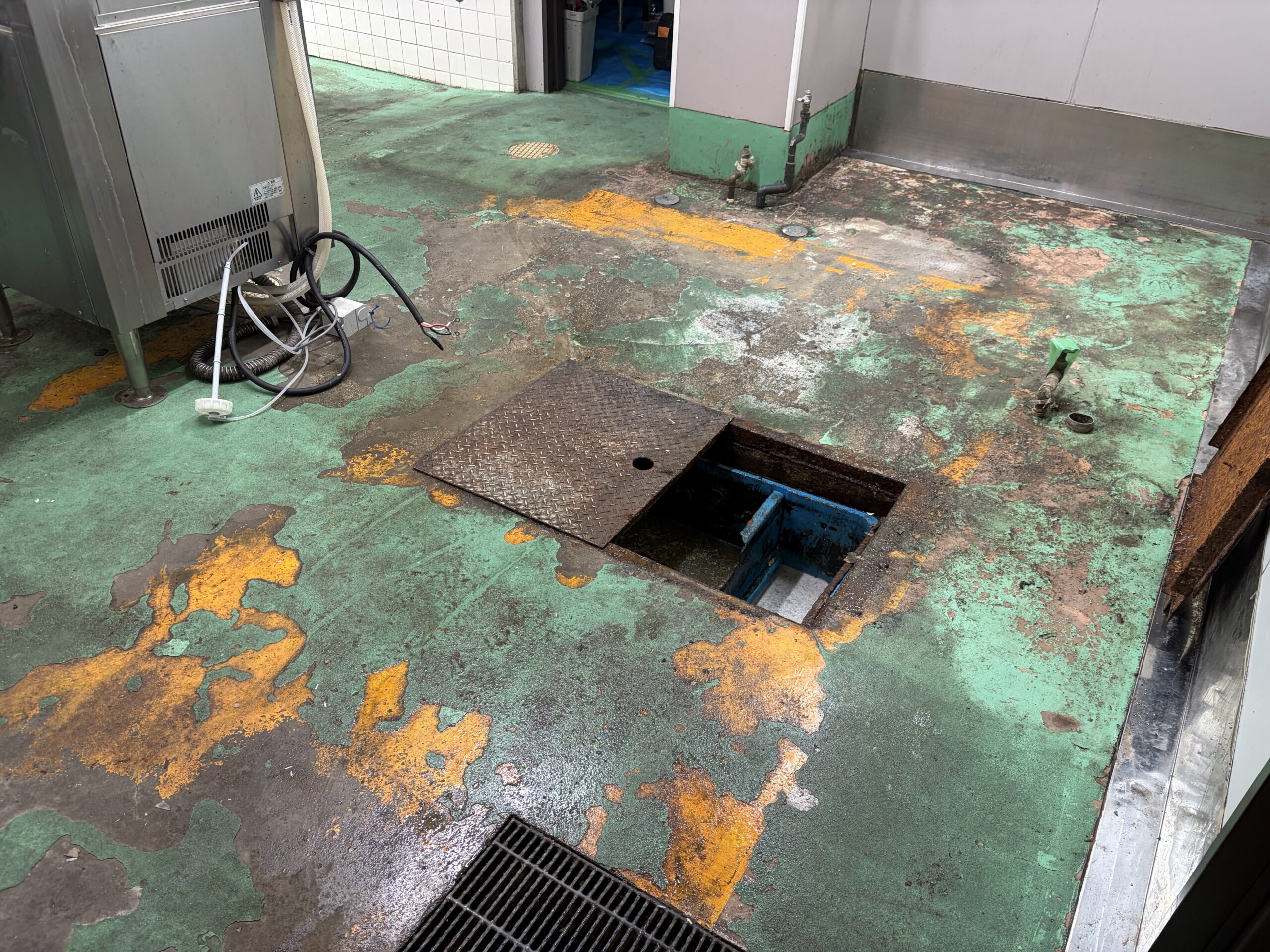食品工場や物流倉庫の冷凍庫では、油脂、糖分、調味液などが床に染み込んでいることがあります。表面だけ洗っても内部に残っていると、塗床材が弾かれる、局所的に剥がれる、ふくれる、といった不具合が起きやすくなります。特に低温環境では、乾いて見えても水分や汚れが残りやすいので、洗浄と除去のやり方が重要です。