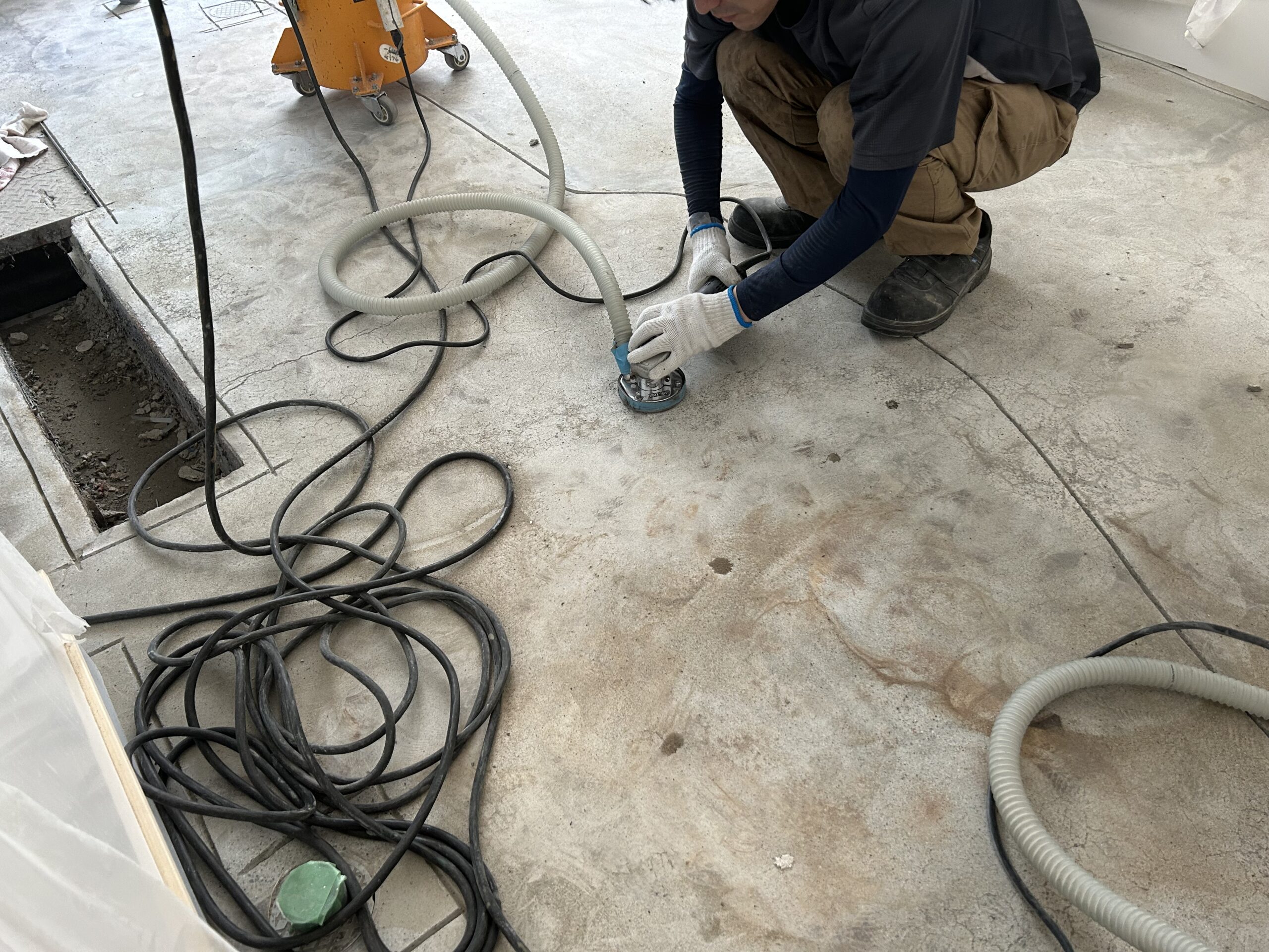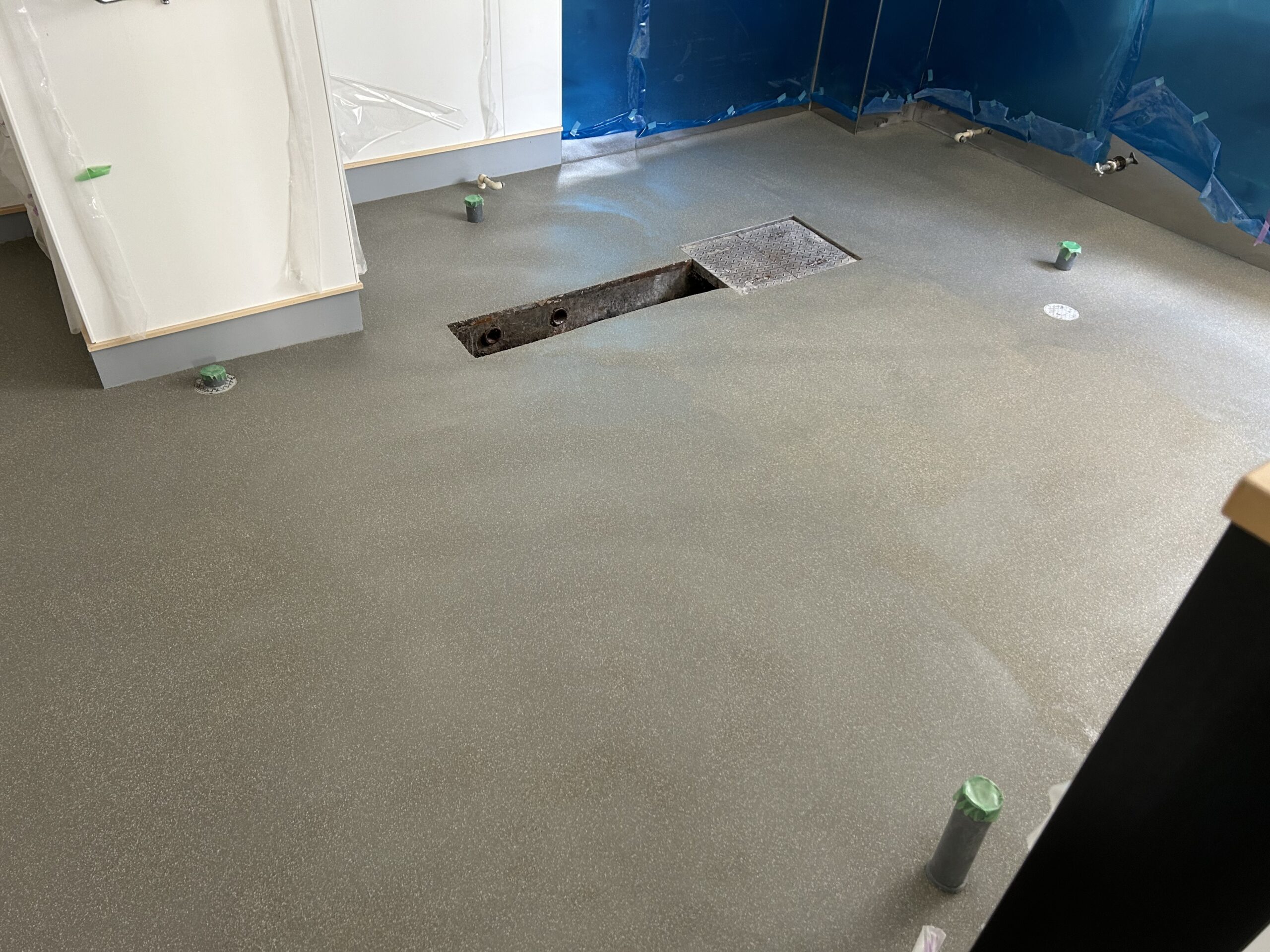 作業としては、下地処理の中でポリシャー研磨、部分的にダイヤモンド研磨、掻き込み目地設置、アイカピュール塗りとなります。材料の特性によって耐熱性と高耐久性、軽防滑性のあるものとなります。