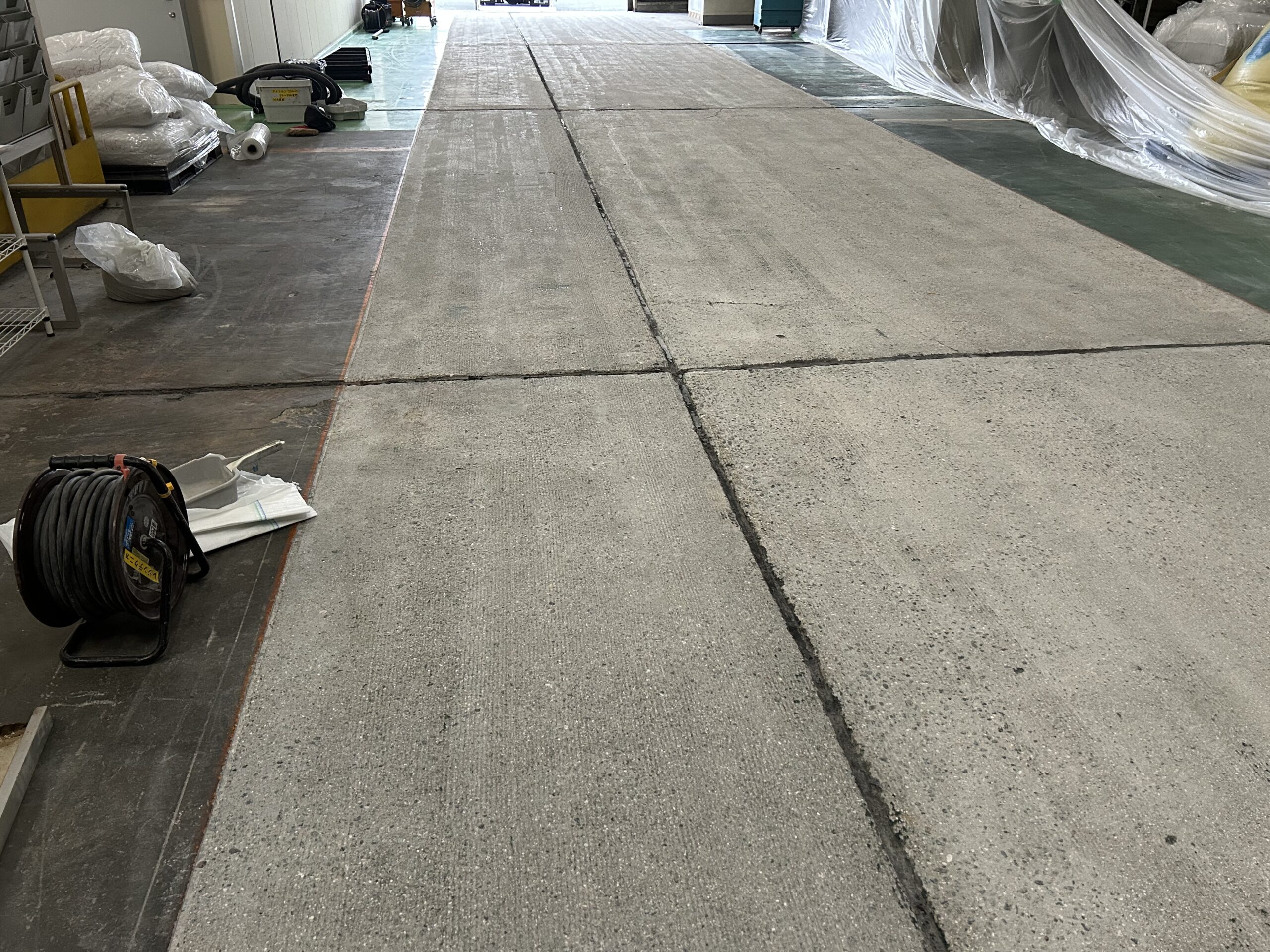 今回の施工では、塗膜を完全撤去し、樹脂モルタルで目地周辺と床全体の不陸修正を行い目止め、仕上げ、歩行帯の設置を、行いました。