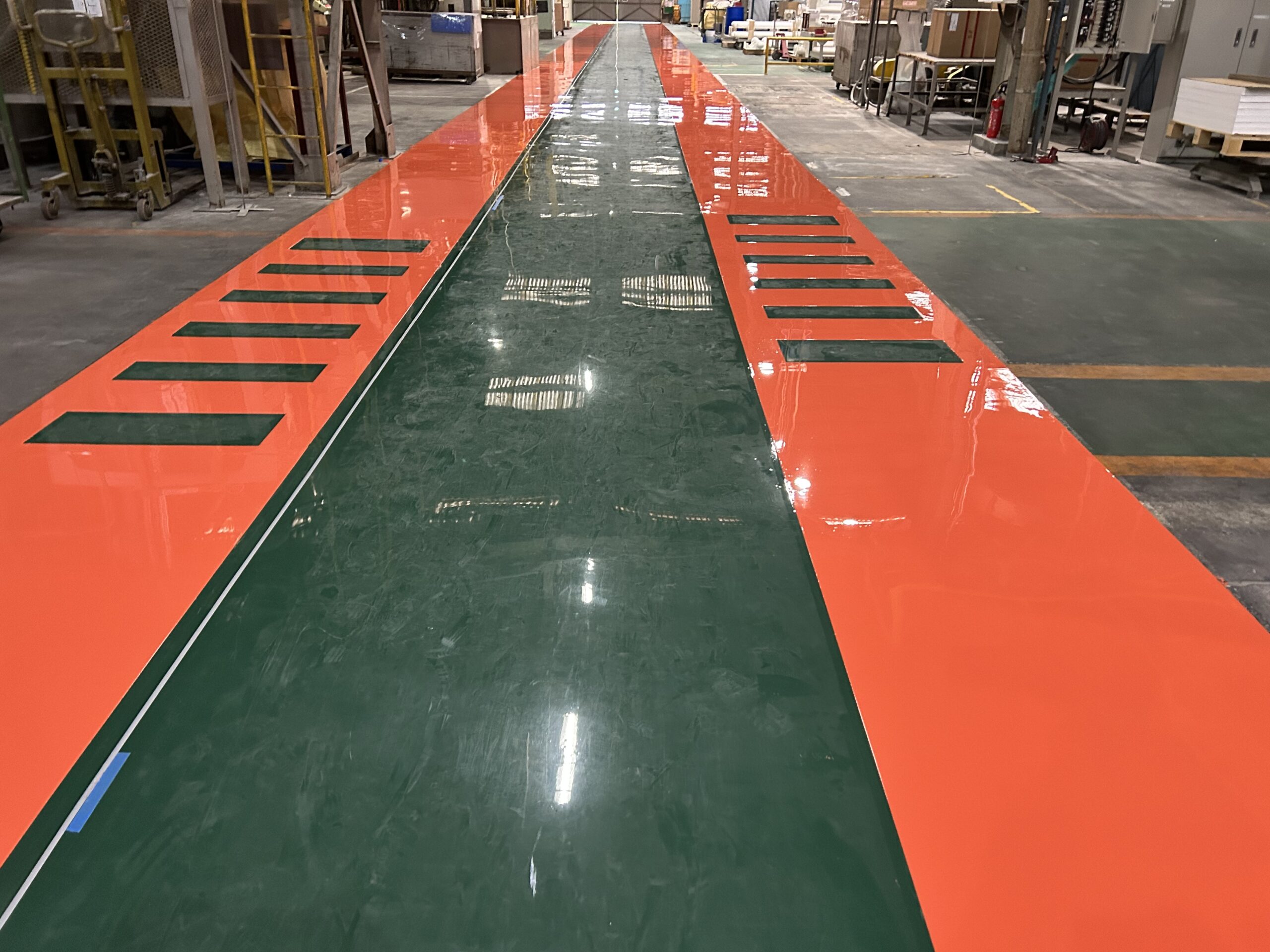 ここで樹脂モルタルを入れるメリットをお伝えしたいと思います。樹脂モルタルを打設する事により、不陸(床の凸凹)が解消する事により、台車やフォークリフトが動きやすくなります。また、厚膜の塗装を行うと稀に下地からの水分に反応して水ぶくれが起きる事があります。このふくれを抑えてくれる働きがあります。そして、なによりも塗装が長持ちします。塗装同士の接着が良くなることで、割れが生じにくく、仮にものを落としたときも、塗料のみで塗装したときに比べて欠けにくいことで長持ちします。